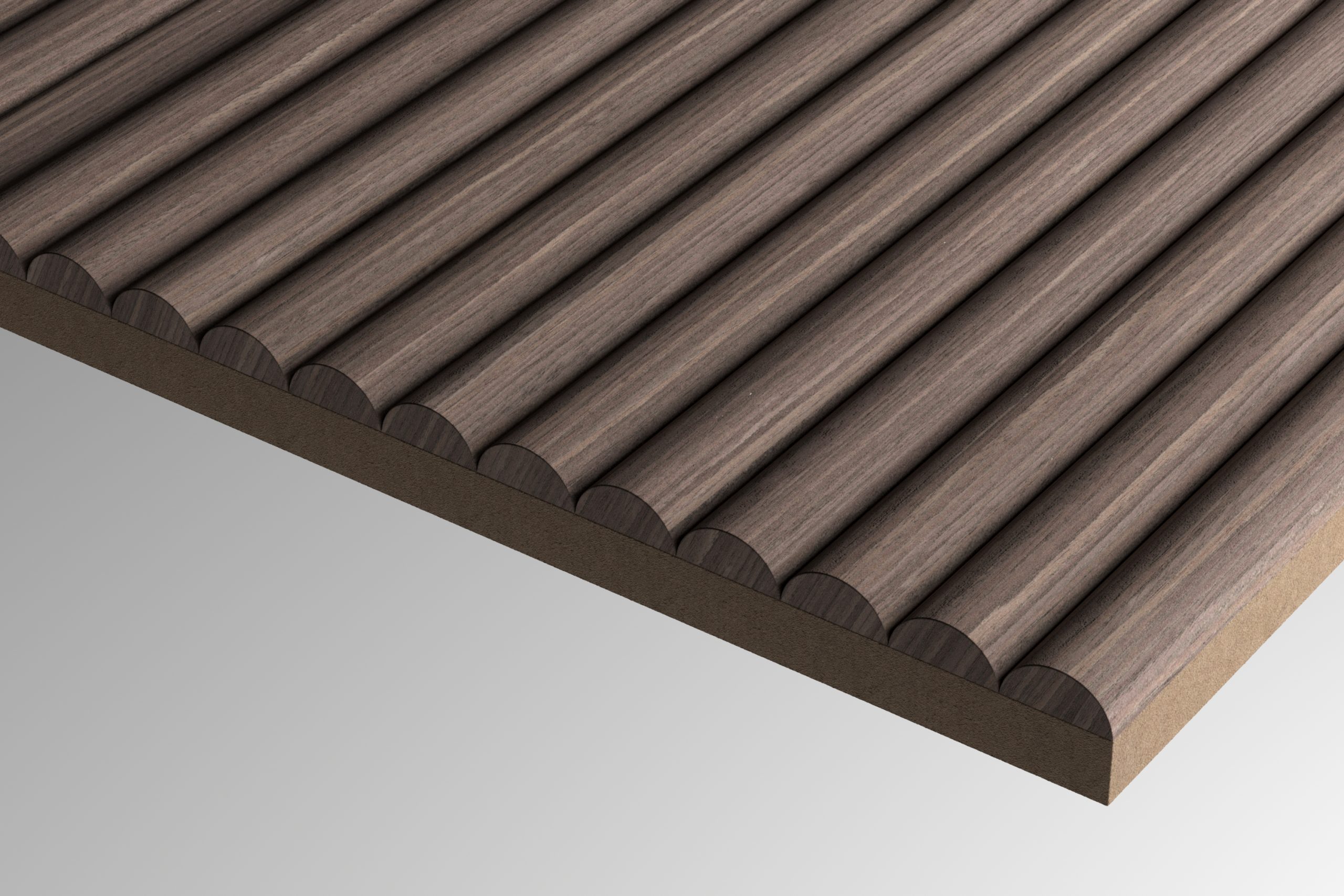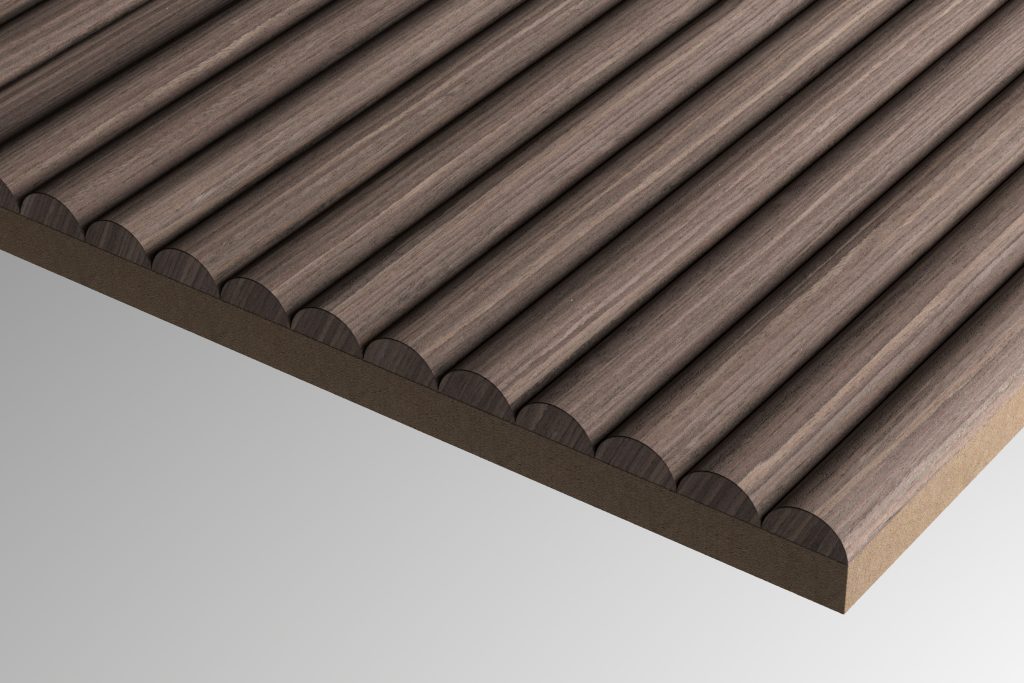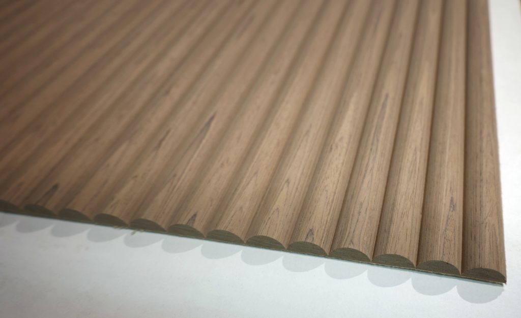 Un motif sculpté en 2D dans l'épaisseur du placage. Une multitude de finitions possibles tout en gardant l'aspect bois. L'assemblage des placages est glissé.