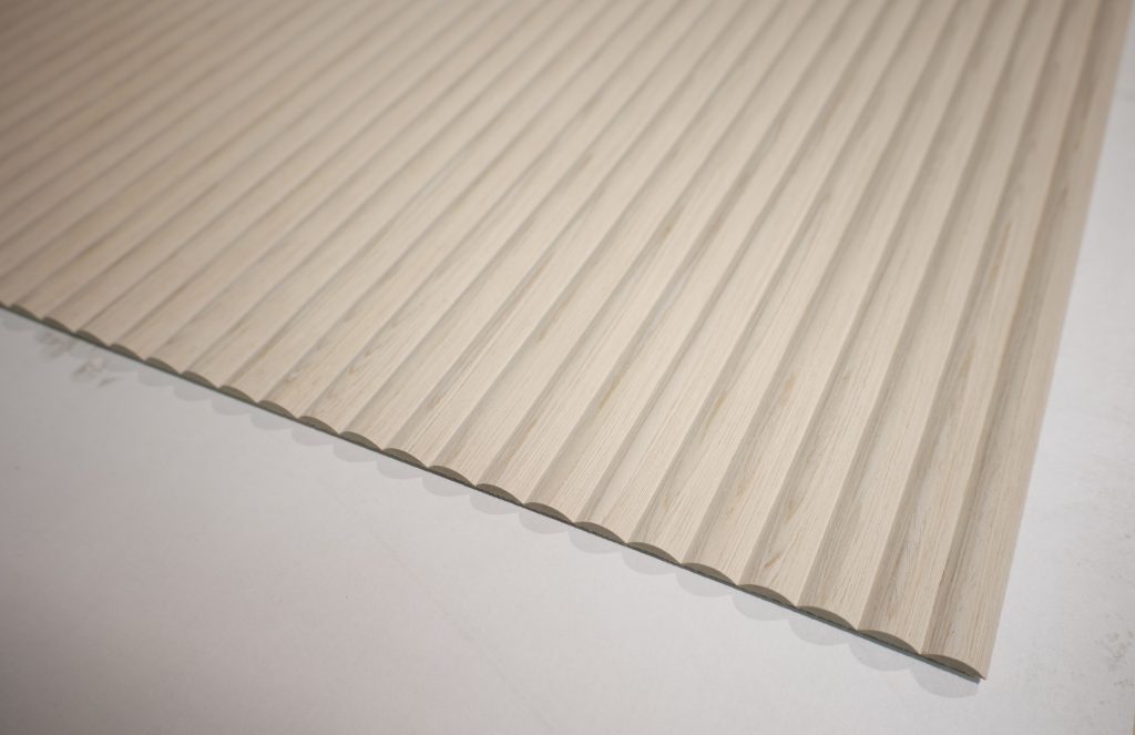 Un motif sculpté en 2D dans l'épaisseur du placage. Une multitude de finitions possibles tout en gardant l'aspect bois. L'assemblage des placages est glissé.